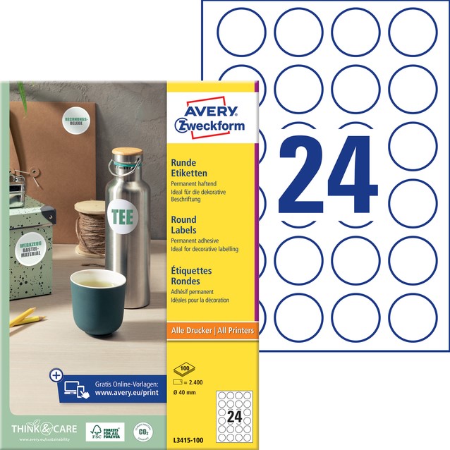 Etiket Avery L3415 rond 40mm wit 2400 stuks