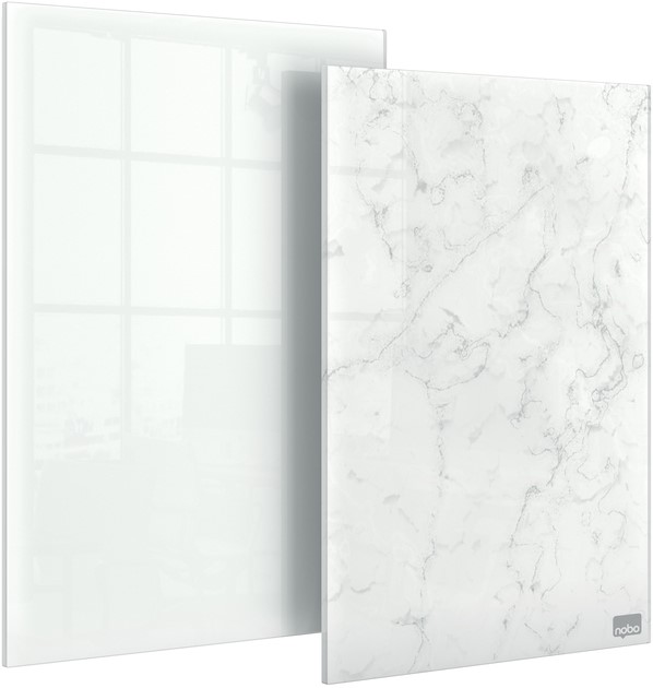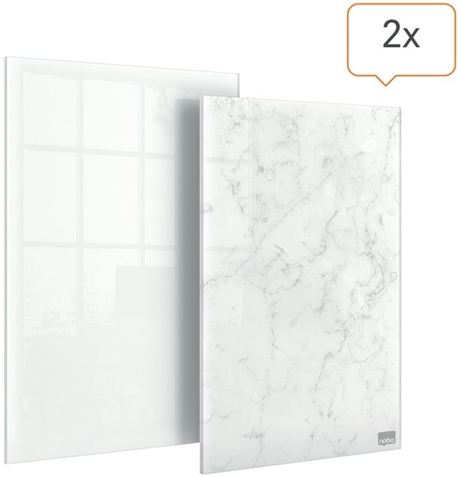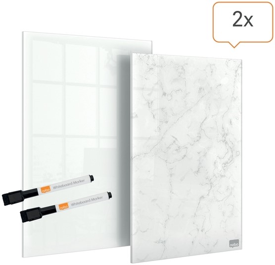 2x droog uitwisbare mini notitieborden van glas met een stijlvol, randloos ontwerp: 1x briljant wit en 1x modern marmereffect.