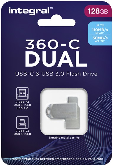 De Integral 360-C Dual USB-C Flash Drive biedt compatibiliteit tussen smartphones, tablets, pc's en Macs.