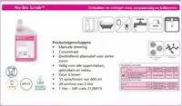 Nu-Bio Scrub is een geconcentreerde reiniger die oppervlakken reinigt en zeepresten en kalkresten verwijdert. Het elimineert ook vieze geurtjes en voorkomt verstoppingen in afvoeren en leidingen. Het belangrijkste actieve ingrediënt van Nu-BioScrub wordt geproduceerd via een biotechnologisch proces waarbij melkzuurfermenterende bacteriën betrokken zijn.