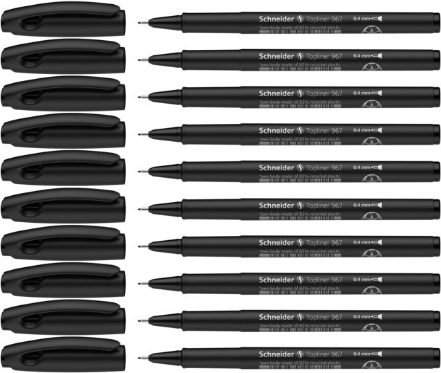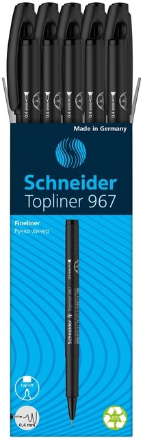 Fineliner Topliner 967 heeft een robuuste schrijfpunt in metalen omhulsel. Hierdoor is deze pen geschikt voor het gebruik van linialen en sjablonen. De cap-off inkt is op waterbasis en droogt niet uit, zelfs niet als de dop 2-3 dagen eraf ligt. Inkt bevat conserveermiddel C(M)IT/MIT waardoor langer houdbaar. De schrijfkleur is herkenbaar aan de dop en uiteinde van de pen. De behuizing bestaat uit mat zwart metallic en is gemaakt van PP voor lange houdbaarheid