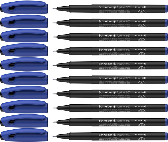 Fineliner Topliner 967 heeft een robuuste schrijfpunt in metalen omhulsel. Hierdoor is deze pen geschikt voor het gebruik van linialen en sjablonen. De cap-off inkt is op waterbasis en droogt niet uit, zelfs niet als de dop 2-3 dagen eraf ligt. Inkt bevat conserveermiddel C(M)IT/MIT waardoor langer houdbaar. De schrijfkleur is herkenbaar aan de dop en uiteinde van de pen. De behuizing bestaat uit mat zwart metallic en is gemaakt van PP voor lange houdbaarheid