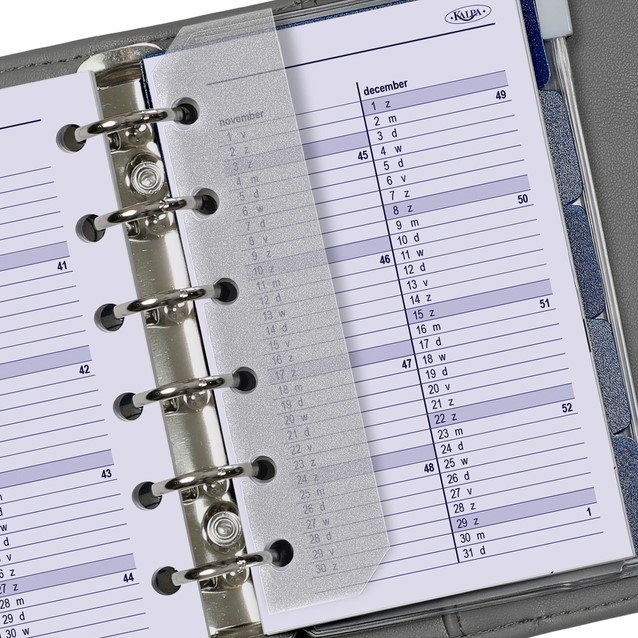 U krijgt extra 5 tabbladen, een adresset, paginascheider, een ritshoesje en een bewaardoos die u ook kunt gebruiken om uw agendavulling van vorig jaar te bewaren.