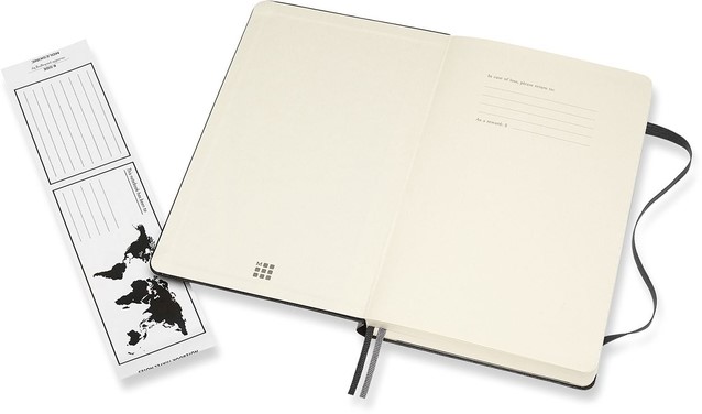 “In geval van verlies”-label op het schutblad, 400 pagina's, uitbreidbare binnenzak aan de achterkant, herbruikbare paperband B-SIDE met extra gedrukte tools, ligt plat, opent op 180°. De geschiedenis van Moleskine zit van binnen. Moleskine srl. creëert en verkoopt FSC®-gecertificeerde producten.