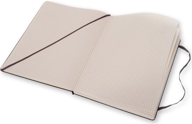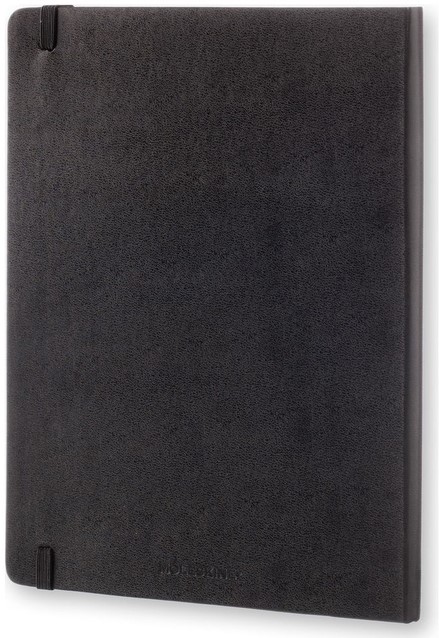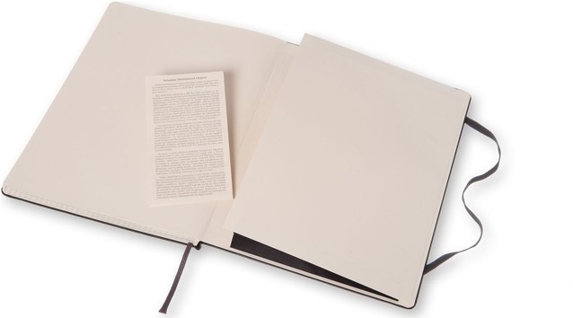 Kenmerken: afgeronde hoeken, elastische sluiting, ivoorkleurig Moleskine-papier, bijpassend leeslint, papier: 70 gsm, zuurvrij, “In geval van verlies”-label op het schutblad, uitbreidbaar binnenvak op achterkaft.