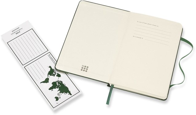 Kenmerken: afgeronde hoeken, elastische sluiting, ivoorkleurig Moleskine-papier, bijpassend leeslint, papier: 70 gsm, zuurvrij, “In geval van verlies”-label op het schutblad, uitbreidbaar binnenvak op achterkaft.