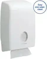 Onze Aquarius™-dispenser voor gevouwen papieren handdoekjes combineert innovatie en stijl met uitzonderlijke prestaties. Deze dispenser voor gevouwen doekjes heeft een gestroomlijnd en afgerond ontwerp zodat vuil niet ophoopt en hij eenvoudig in één enkele beweging kan worden gereinigd. Het volledig gesloten dispensersysteem zorgt ervoor dat u alleen het product aanraakt dat u gebruikt. Dit helpt de hoge hygiënestandaarden op de werkplek te ondersteunen.