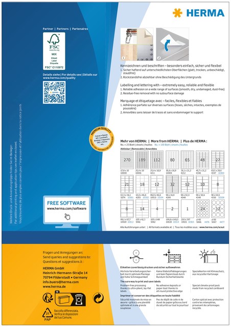 Zelfklevende etiketten op A4-vellen, etiketformaat 63,5x38,1mm wit verwijderbaar, 100 vel per verpakking. Stevig hechtend op alle gladde, droge, onbeschadigde en stofvrije oppervlakken. Te verwijderen zonder resten achter te laten en zonder de ondergrond te beschadigen. Ideaal voor het tijdelijk of wisselend labelen en voor oppervlakken die niet mogen worden beschadigd. Zeer goede drukresultaten op alle laser- en inkjetprinters, kopieerapparaten, kleurenlaserprinters en kleurenkopieerapparaten. Storingvrije verwerking dankzij veiligheidsrand rondom en optimale vlakligging. Milieuvriendelijk: FSC® Mix Credit-gecertificeerd, chloorvrij gebleekt, oplosmiddelvrije contactlijm. Etiketten zijn 100 % recyclebaar via het oud papier, verpakking van gerecycled karton. Gratis softwareoplossingen: www.herma.com/software.