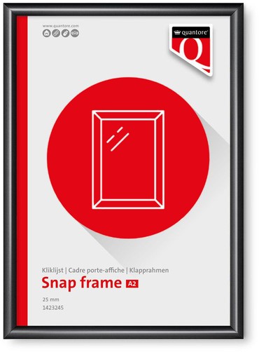 Met de Quantore Premium kliklijst in A2-formaat geef je je posters en documenten een strakke en professionele presentatie. Het hoogwaardige aluminium frame in zwart zorgt voor een moderne en elegante uitstraling, ideaal voor kantoren, winkels en openbare ruimtes. De transparante ontspiegelende folie beschermt je inhoud en zorgt voor optimale zichtbaarheid zonder storende reflecties. Met een randbreedte van 25 mm en verborgen montagegaten biedt deze kliklijst een nette afwerking. Het meegeleverde ophangmateriaal maakt eenvoudige montage aan de muur mogelijk, zodat je snel en eenvoudig kunt wisselen van poster. Kenmerken:
