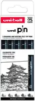 Set van Uni-ball Pin technische tekenpennen. De inkt van deze pennen is weerbestendig, waterbestending en oplosmiddelbestendig en vervaagt niet. Hierdoor blijven tekeningen lang bewaard. De pen beschikt over een regelmatige inkttoevoer en is ondermeer geschikt voor plattegronden, lichtdrukken en schetsen. Deze set bestaat uit 4 fijnschrijvers met de breedtes 0,03mm, 0,1mm, 0,5mm en 0,8mm en 1 brushpen.