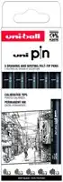 Set van Uni-ball Pin technische tekenpennen. De inkt van deze pennen is weerbestendig, waterbestending en oplosmiddelbestendig en vervaagt niet. Hierdoor blijven tekeningen lang bewaard. De pen beschikt over een regelmatige inkttoevoer en is ondermeer geschikt voor plattegronden, lichtdrukken en schetsen. Deze set bestaat uit 4 fijnschrijvers met de breedtes 0,05 mm, 0,3 mm, 0,8 mm, 1,2 mm n 1 brushpen.