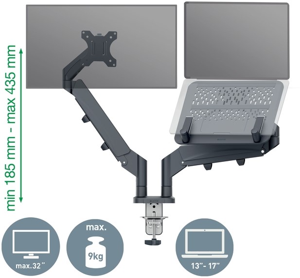 Monitor- en laptoparm Leitz Ergo ruimtebesparend dubbel donkergrijs