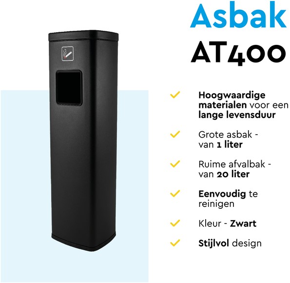 2-in-1 ontwerp: prullenbak en asbak?: Deze veelzijdige prullenbak, met een afmeting van 22x18x81cm(lxbxh), heeft een geïntegreerde RVS asbak van 1 liter, ideaal voor het tegengaan van sigarettenresten. Het asbakreservoir heeft ook een asbakdeksel waarmee sigaretten eenvoudig kunnen worden uitgedrukt. Het ontwerp zorgt voor een nette en geordende ruimte, zonder dat as of sigarettenpeuken rondslingeren.?