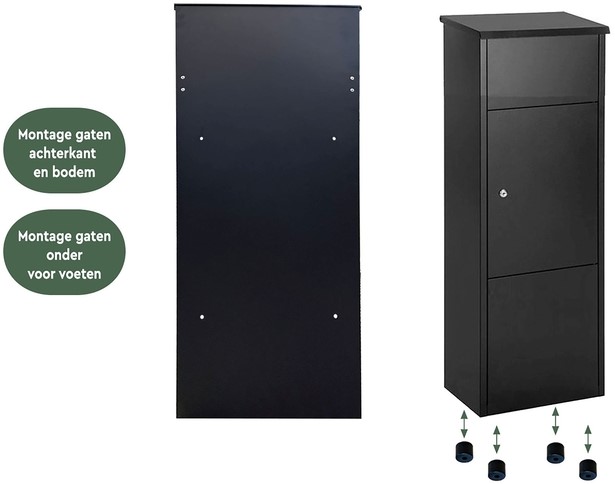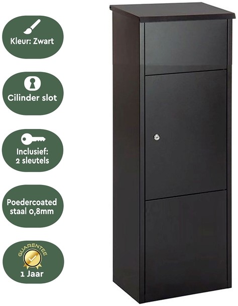 Materiaal en uitvoering: De zwarte dropbox is gemaakt van duurzaam en robuust materiaal dat zorgt voor een lange levensduur. Afgewerkt met gegalvaniseerd poedercoated staal, zodat je pakketten bestand zijn tegen alle weersinvloeden. De pakketbrievenbus heeft een formaat van 105x38x24cm. Met de ruime brievenbus opening passen er pakketten in met een maximaal formaat van 33.5x20cm. Gebruiksvriendelijk en veilig: Pakketten en post zijn te deponeren door de bovenklep op te tillen. Wanneer de klep sluit wordt het pakket of de brief automatisch doorgeschoven naar het onderste compartiment. Hier worden ze veilig bewaard achter een gesloten deur. Door de terugslagklep is het onmogelijk om brieven en pakketten uit de box te halen en daarmee diefstal veilig. Het stevige cilinderslot, inclusief 2 sleutels, zorgt ervoor dat alleen jij toegang hebt tot je ontvangen post en pakketten.