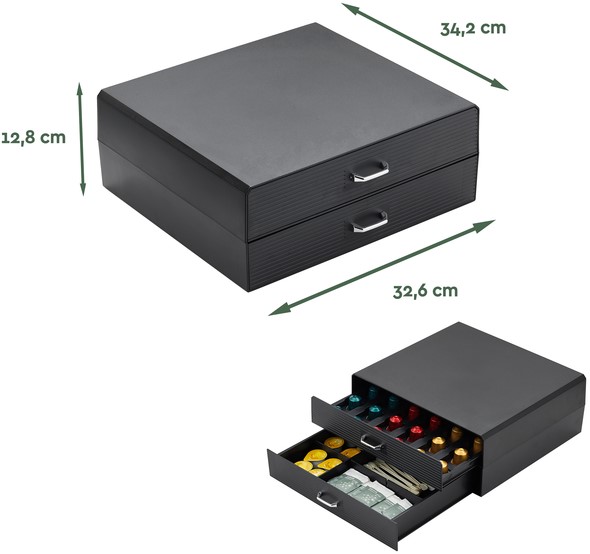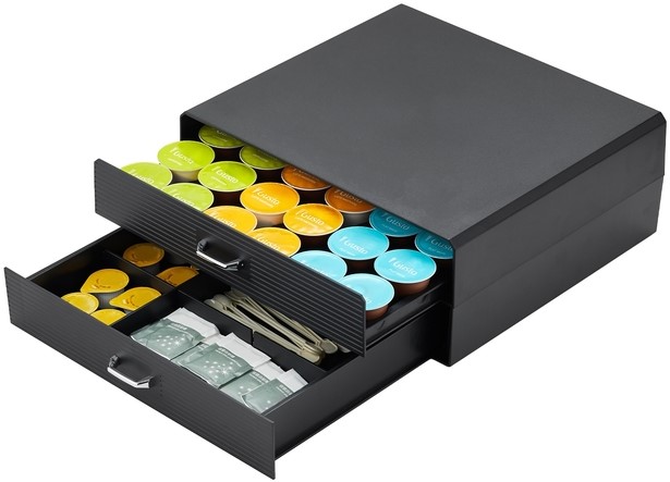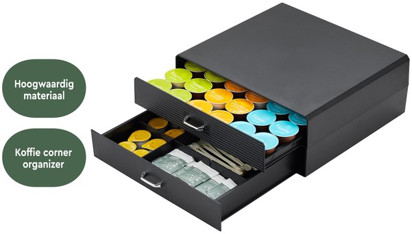 Altijd zoeken naar een koffiecup? De hele la vol maar alle smaken en soorten door elkaar? De BRASQ Koffiecapsulehouder met 2 lades zorgt ervoor dat al je cups en accessoires netjes georganiseerd voor het pakken liggen. Maar ook alle overige koffie- en thee benodigdheden, zoals suiker- en roerstaafjes en melk, heb je alles overzichtelijk bij de hand. De praktische koffiecuphouder past perfect in de koffiecorner van een autogarage, een badkamershowroom of op kantoor. Maar zeker ook in de keuken van je eigen woning kun je de houder eenvoudig onder of naast je koffiemachine plaatsen. De capsulehouder heeft 1 grote onderlade, met vakverdeling, en daarboven 1 lade zonder vakverdeling. Samen bieden ze plaats aan 50 cups Nespresso of 30 K-cup of Vertuo cups. Dankzij de vorm kun je de cuphouder perfect onder je koffiezetapparaat bewaren, zodat je ruimte in de keuken bespaart.