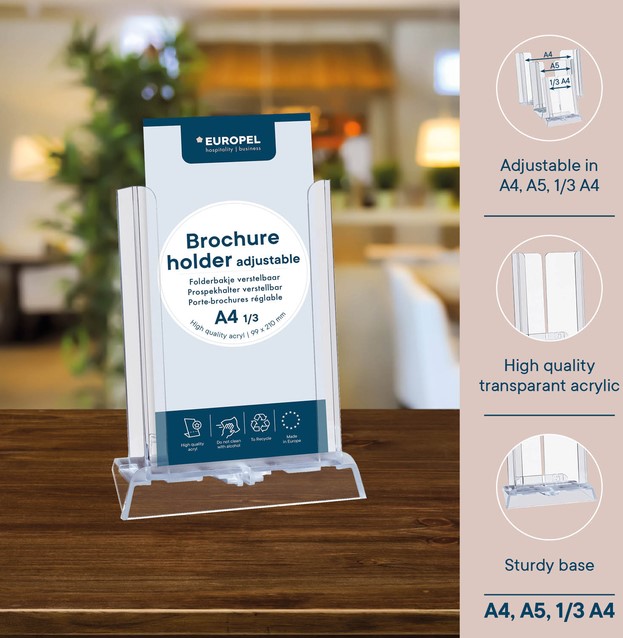 Het Europel verstelbare folderbakje is de perfecte oplossing voor het presenteren van brochures, folders en flyers. Dankzij het verstelbare ontwerp is het geschikt voor diverse formaten, zoals A4, A5 en 1/3 A4. Belangrijkste kenmerken: