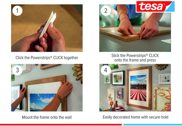 Decoraties zorgen voor de finishing touch in een stijlvol huis of werkomgeving. De tesa® Powerstrips CLICK bieden het ideale alternatief voor spijkers en maken het makkelijk om fotolijsten en andere vlakke wanddecoraties te bevestigen. Het unieke klikgeluid laat u weten dat het voorwerp goed op zijn plaats zit.
