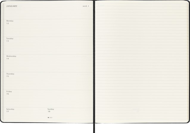 De Moleskine 18 Maanden Weekly Notebook Planner loopt van juli tot december. Deze populaire planner is ingedeeld om de afspraken van de week aan de linkerkant weer te geven en heeft een gelinieerde pagina voor notities en ideeën aan de rechterkant. Hierdoor is het notebook perfect voor studenten, docenten en professionals. De planner heeft een harde of zachte kaft met afgeronde hoeken en een elastische sluiting.