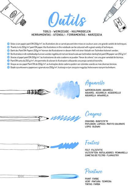 Of je nu fan bent van kleurpotloden, stiften, aquarel of andere verf, dit blok is je beste vriend! Het boek bevat zes prachtige illustraties, die elk drie keer worden herhaald. Zo krijg je de kans om verschillende kleurtechnieken en -stijlen te ontdekken. Er is ook een blad bijgevoegd met handige tips en een inspiratieblad om je creativiteit een boost te geven! Spiraalblok A4+ met 20 vellen Paint'ON papier van 250g (6 illustraties x3 + 1 blad met accessoires + 1 inspiratieblad). De vellen zijn microperforeerd en afscheurbaar (afmeting na afscheuren: A4). Omslag in gekorreld papier voorzien van ophangstrip.