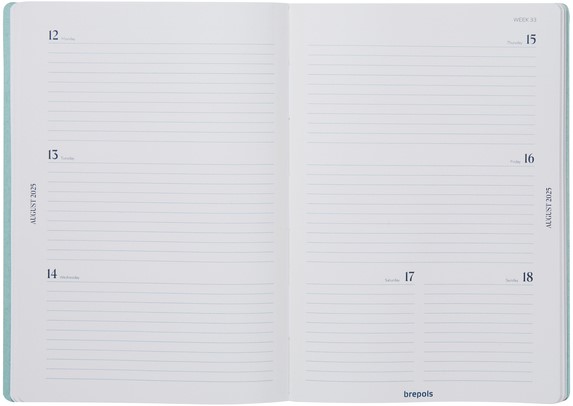 Brepols agenda Essential Urban Engelstalig met 1 week op 2 pagina's. Boekgebonden agenda op wit papier met een soepele papieren omslag die gedeeltelijk gemaakt is van leerresten op formaat 14,8 x 21 cm