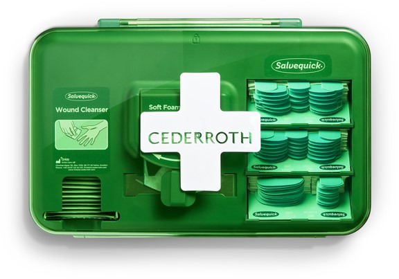 Inhoud: 1 Salvequick wondreiniger, 40 st. (REF 3227) 1 Cederroth Soft Foam Bandage, 4,5 m (REF 51011010) 2 Blue Detectable pleisters (REF 51030127) 1 Blue Detectable Pleisters Vingertop/Normaal (REF 51030126) 1 Navulsleutel