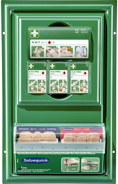 Inhoud: 1 Cederroth 4-in-1 bloedstelpend verband 3 Cederroth 4-in-1 mini bloedstelpende verbanden 1 st. Salvequick Pleisterautomaat