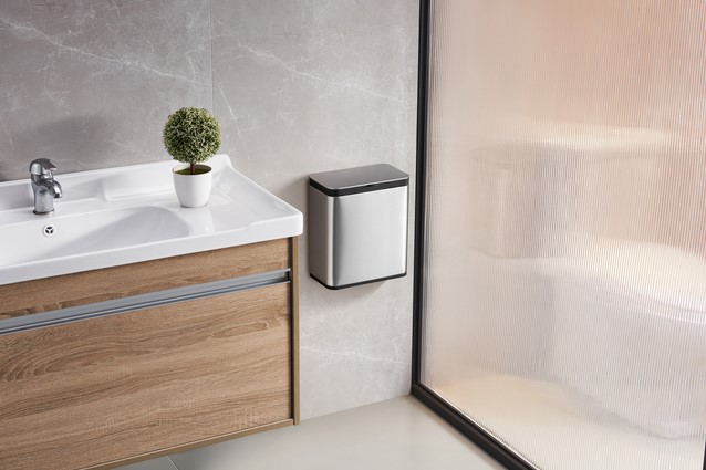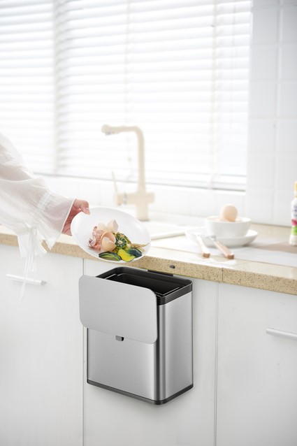 Compact afvalbakje van geborsteld RVS voor GFT-afval. De kunststof binnenemmer heeft een inhoud van 7 liter. Makkelijk op te hangen aan een keukenkastdeurtje, tevens te bevestigen aan een muur of flexibel te plaatsen op het aanrecht. De twee manieren om het deksel te openen verhoogt de efficiëntie in gebruik.