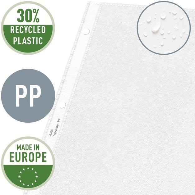 Hoogwaardige showtassen met een heldere matte afwerking, ideaal voor dagelijks gebruik thuis, op kantoor of op school. De versterkte strip met 4 gaten en meerdere perforaties maakt het handig opbergen van documenten in ordners en ringbanden mogelijk en beschermt ze tegen vocht, stof en vuil. Opent aan de linkerkant voor gemakkelijke toegang tot documenten zonder dat je het ringbandmechanisme los hoeft te maken en een klep om te voorkomen dat de papieren eruit glijden. Het copy safe en zuurvrije materiaal zorgt voor een langdurige bescherming van de documenten. Gemaakt van PP (polypropyleen) met 30% pre-consumer plastic, 100% recyclebaar.