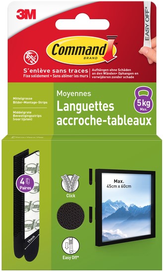 Command™ Middelgrote zwarte bevestigingsstrips zijn onze innovatieve oplossing voor het veilig en zonder beschadigingen ophangen van ingelijste afbeeldingen en kunstwerken. Ze hechten sterk en laten na verwijdering geen sporen achter dankzij de 3M rekontgrendelingstechnologie.