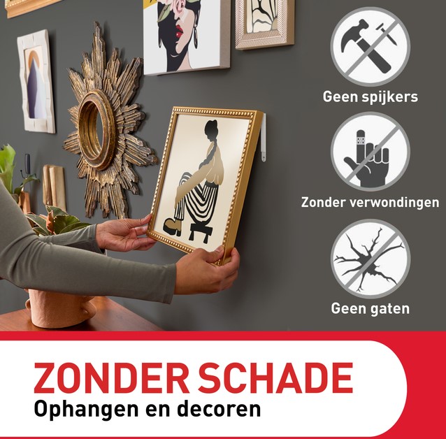 Hangt zonder beschadigingen op, hecht stevig en laat na verwijderen geen sporen achter.