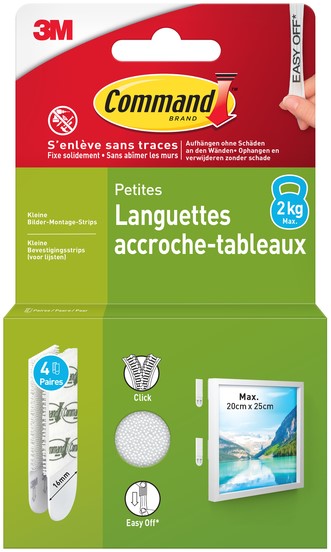 Command™ Kleine bevestigingsstrips zijn onze innovatieve oplossing voor het veilig en zonder beschadigingen ophangen van ingelijste afbeeldingen en kunstwerken. Ze hechten sterk en laten na verwijdering geen sporen achter dankzij de 3M rekontgrendelingstechnologie.