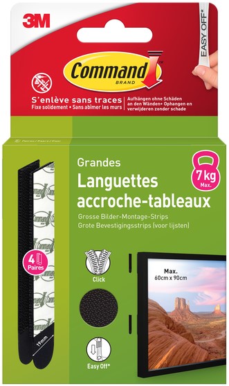 Command™ Grote zwarte bevestigingsstrips zijn onze innovatieve oplossing voor het veilig en zonder beschadigingen ophangen van grotere of zwaardere ingelijste afbeeldingen en kunstwerken. Ze hechten sterk en laten na verwijdering geen sporen achter dankzij de 3M rekontgrendelingstechnologie.