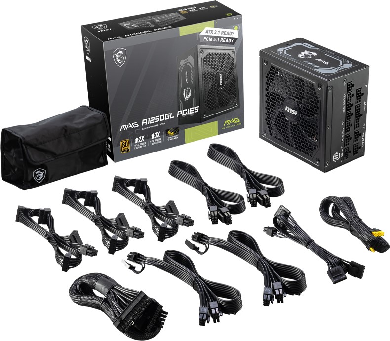 MSI MAG A1250GL PCIE5, 1250 W, 100 - 240 V, 50/60 Hz, Actief, 90 procent, Overstroom, Te hoog vermogen, Over total voltage, Overspanning, Kortsluiting, Onder spanning