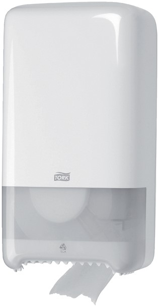 De toiletrollen passen in de Tork Twin Mid-size toiletrol dispensers, een modern en efficiënt systeem.