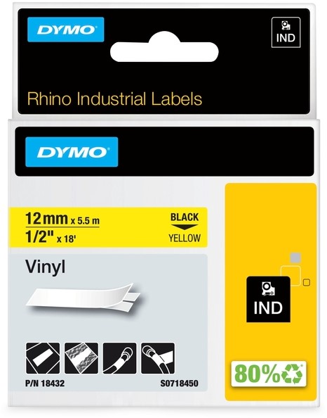 Labeltape Dymo Rhino industrieel vinyl 12mm wit op zwart