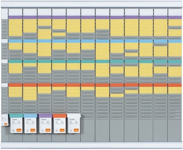 Met deze T-kaart planningset heb je alle middelen voor een duurzame, effectieve planning. De set voor wandmontage heeft 12 kolommen voor formaat 2 T-kaarten, een indexkolom en biedt plaats aan in totaal 32 T-kaarten.