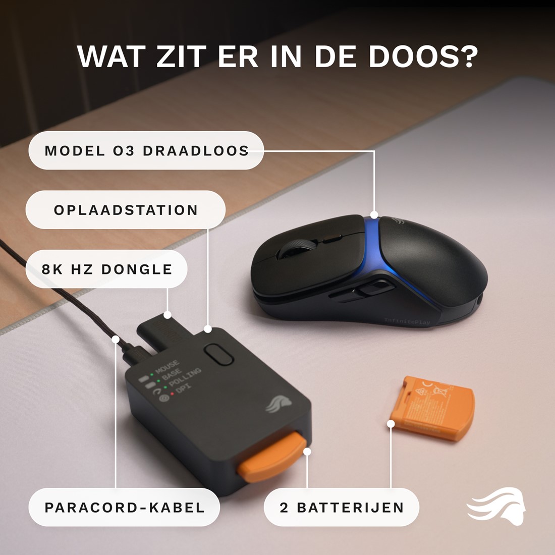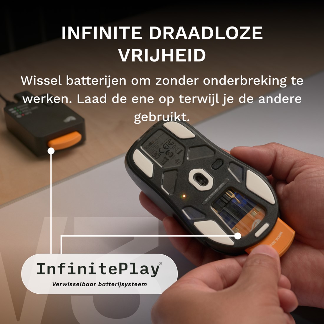 Het draadloze Model O3 met InfinitePlay is de eerste écht draadloze gamingmuis die je nooit aan hoeft te sluiten.