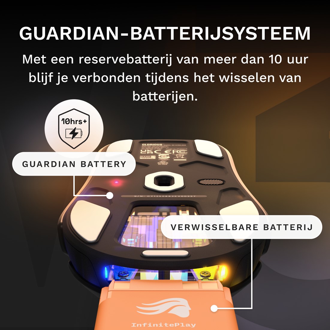 Het unieke Guardian-batterijsysteem houdt je muis tot wel 10 uur aan de praat als je de verwisselbare batterij eruit haalt. Geen paniek dus, je kunt gewoon doorvechten.