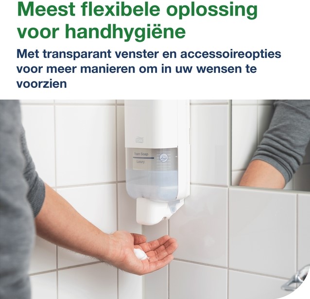 De Tork Zeep en Handdesinfectie Dispenser past overal. Deze dispenser kan worden gevuld met een ruime keuze aan Tork handzepen, handdesinfectieproducten en douchegels in hygiënisch afgesloten flessen, om te voldoen aan de wensen van uw bedrijf. De betrouwbare dosering, verschillende doseeropties en het gecertificeerde 'Easy-to-use'-ontwerp bevorderen een goede handhygiëne voor alle gebruikers. Laat een blijvende indruk achter op bezoekers met het functionele, moderne ontwerp van onze meest veelzijdige dispenser voor zeep en handdesinfectie. De voordelen op een rijtje: