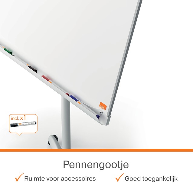 Deze moderne mobiele magnetische whiteboard flipover heeft een strakke kunststof afwerking en is de perfecte aanvulling voor elk kantoor of school. Het gelakte stalen oppervlak biedt een betere uitwisbaarheid, is minder gevoelig voor 'ghosting' en bestand tegen krassen en deuken, waardoor het ideaal is voor gemiddeld gebruik. Het gladde oppervlak verbetert het schrijven en zorgt voor duidelijke, opvallende communicatie voor effectieve samenwerking. De mobiele flipover heeft een verrijdbaar onderstel voor eenvoudig verplaatsen tussen locaties en vergrendelbare wielen voor extra stabiliteit. Op het magnetische oppervlak kunnen gemakkelijk notities, foto's en belangrijke informatie worden bevestigd, terwijl de geïntegreerde pennengoot whiteboardmarkers en magneten georganiseerd houdt.