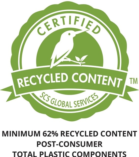 Gecertificeerd gerecycled materiaal dat voldoet aan de SCS Recycled Content Standard V8-0 voor minimaal 62% post-consumer recycled content van de totale plastic onderdelen en geleverd in verpakkingen die zijn gecertificeerd door de Forest Stewardship Council (FSC®).