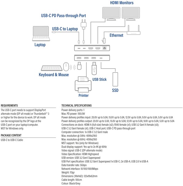 Opladen: 100W Power Delivery passthrough voor gelijktijdig opladen van je laptop (lader niet inbegrepen).