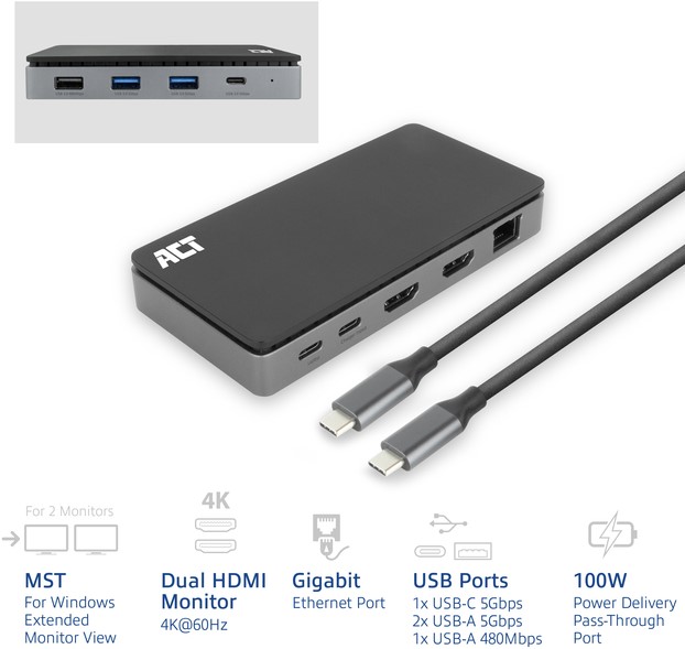 Dockingstation ACT USB-C 4K MST voor 2 HDMI monitoren