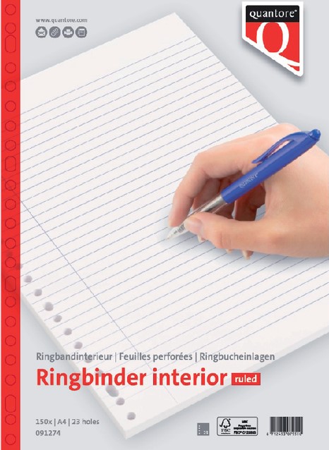 Het interieur Quantore A4 23-gaats lijn 150vel is ideaal voor wie graag georganiseerd en overzichtelijk werkt. Dankzij de 23-gaats perforatie past dit gelinieerde papier perfect in A4-ringbanden en ordners met multiringmechaniek. De afmeting van 220x297 mm is inclusief perforatierand, waardoor je optimaal gebruik maakt van de schrijfruimte. Met 150 vellen van 70 grams papier heb je voldoende voorraad voor aantekeningen, notulen of studie. Het papier is FSC-gecertificeerd en draagt zo bij aan een verantwoorde omgang met grondstoffen. Een betrouwbare keuze voor school, kantoor of thuisgebruik. Kenmerken: