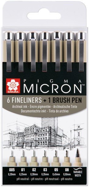 Etui met 6 Pigma Micron fineliners in verschillende puntdiktes + een zwarte Pigma Brush met flexibele penseelpunt.
