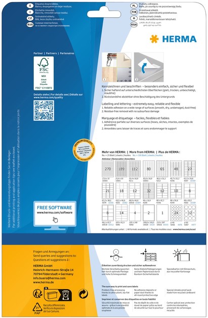 Zelfklevende etiketten op A4-vellen, etiketformaat 17,8x10mm wit verwijderbaar, 25 vel per verpakking. Stevig hechtend op alle gladde, droge, onbeschadigde en stofvrije oppervlakken. Te verwijderen zonder resten achter te laten en zonder de ondergrond te beschadigen. Ideaal voor het tijdelijk of wisselend labelen en voor oppervlakken die niet mogen worden beschadigd. Zeer goede drukresultaten op alle laser- en inkjetprinters, kopieerapparaten, kleurenlaserprinters en kleurenkopieerapparaten. Storingvrije verwerking dankzij veiligheidsrand rondom en optimale vlakligging. Milieuvriendelijk: FSC® Mix Credit-gecertificeerd, chloorvrij gebleekt, oplosmiddelvrije contactlijm. Etiketten zijn 100 % recyclebaar via het oud papier, verpakking van gerecycled karton. Gratis softwareoplossingen: www.herma.com/software.