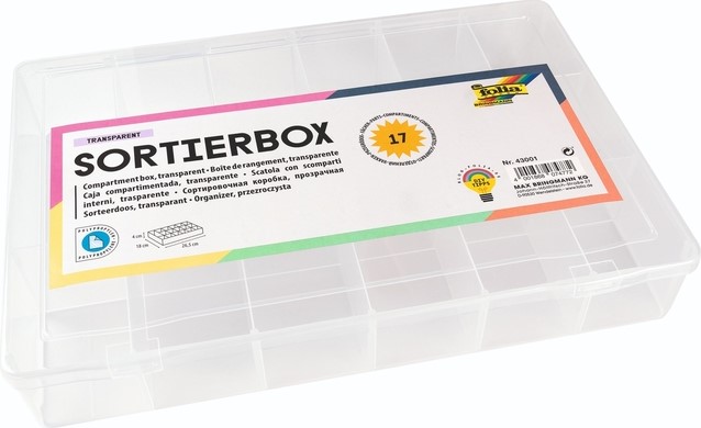 Sorteerbox met 17 vakken, vlakke kunststof box voor het bewaren van kleine kantoorartikelen of knutselmateriaal.