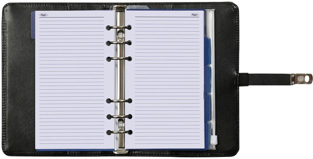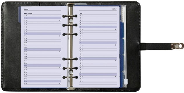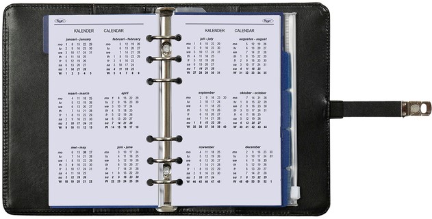 De organizer is voorzien van tabbladen, doorzichtig vak met rits, pagina-scheider, notitieblaadjes en adresboekje.